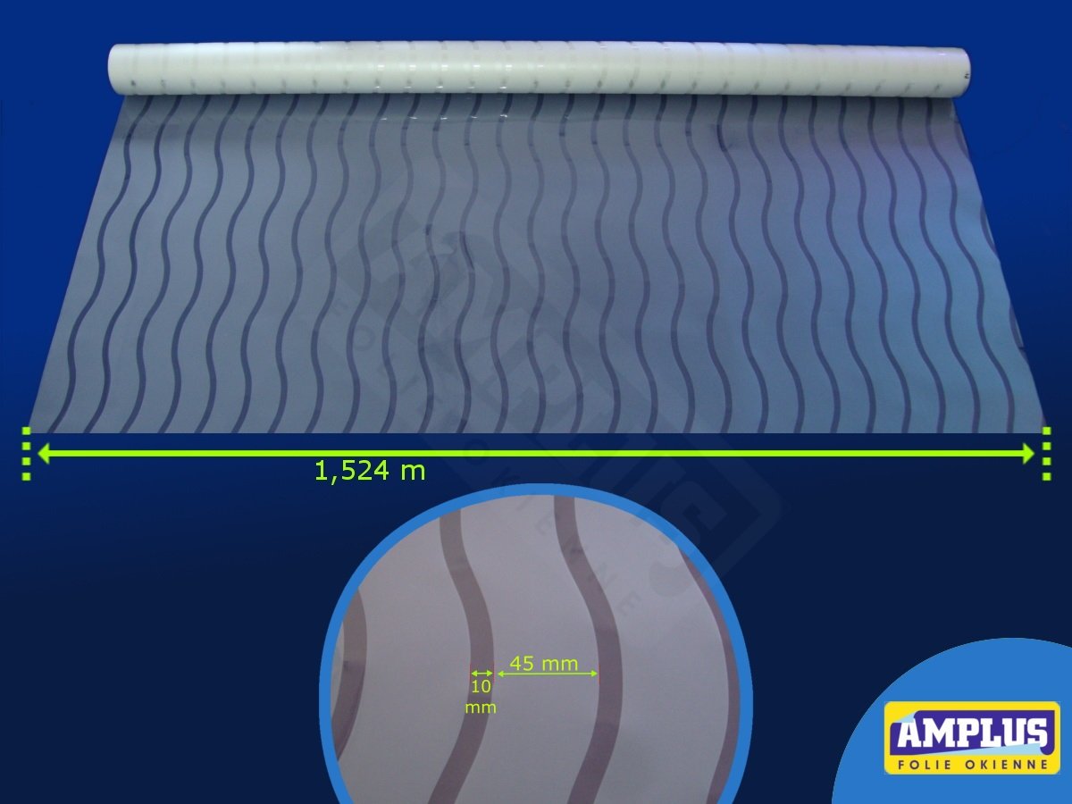 Ciekawy wzór folii stanowią matowe fale o szerokości 45mm. Nowoczesny, choć zbliżony do klasycznego, półprzezroczysty wzór falujących linii, pasuje do wnętrz w których lubisz wypoczywać. Idealny wybór do salonów lub nowoczesnych sypialni, dobrze sprawdzi się również na przeszklonych drzwiach. Wyobraź sobie wspaniale zestrojenie dekoracji okna z odpoczynkiem przy dźwiękach ulubionej muzyki.